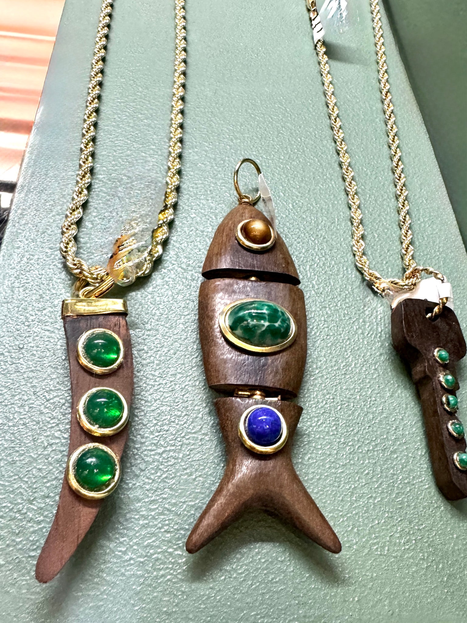A symbol of luck, creativity, and flow, this design combines the organic warmth of carved wood with the sophistication of vibrant gemstones.